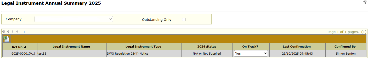 - A list of all the company’s live legal instruments is displayed. Each will state the status of the last annual report and contains a drop-down box to tell us if it is on track or not. Select Yes or No.